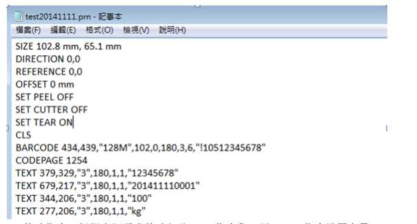 3. 修改指令,根據實際需求修改部分 TSPL 指令集,用 INPUT 指令設置變量。 DOWNLOAD F,"test.BAS" SIZE 102.8 mm, 65.1 mm DIRECTION 0,0 REFERENCE 0,0 OFFSET 0 mm SET PEEL OFF SET CUTTER OFF SET TEAR ON CLS INPUT A$ INPUT B$ BARCODE 434,439,"128M",102,0,180,3,6,"!10512345678" CODEPAGE 1254 TEXT 379,329,"3",180,1,1,"12345678" TEXT 679,217,"3",180,1,1,A$ TEXT 344,206,"3",180,1,1,B$ TEXT 277,206,"3",180,1,1,"kg" PRINT 1,1 EOP